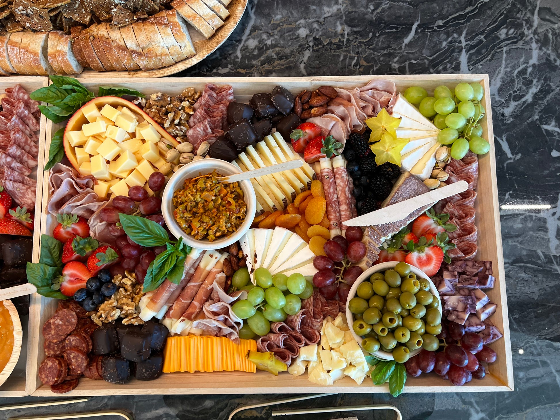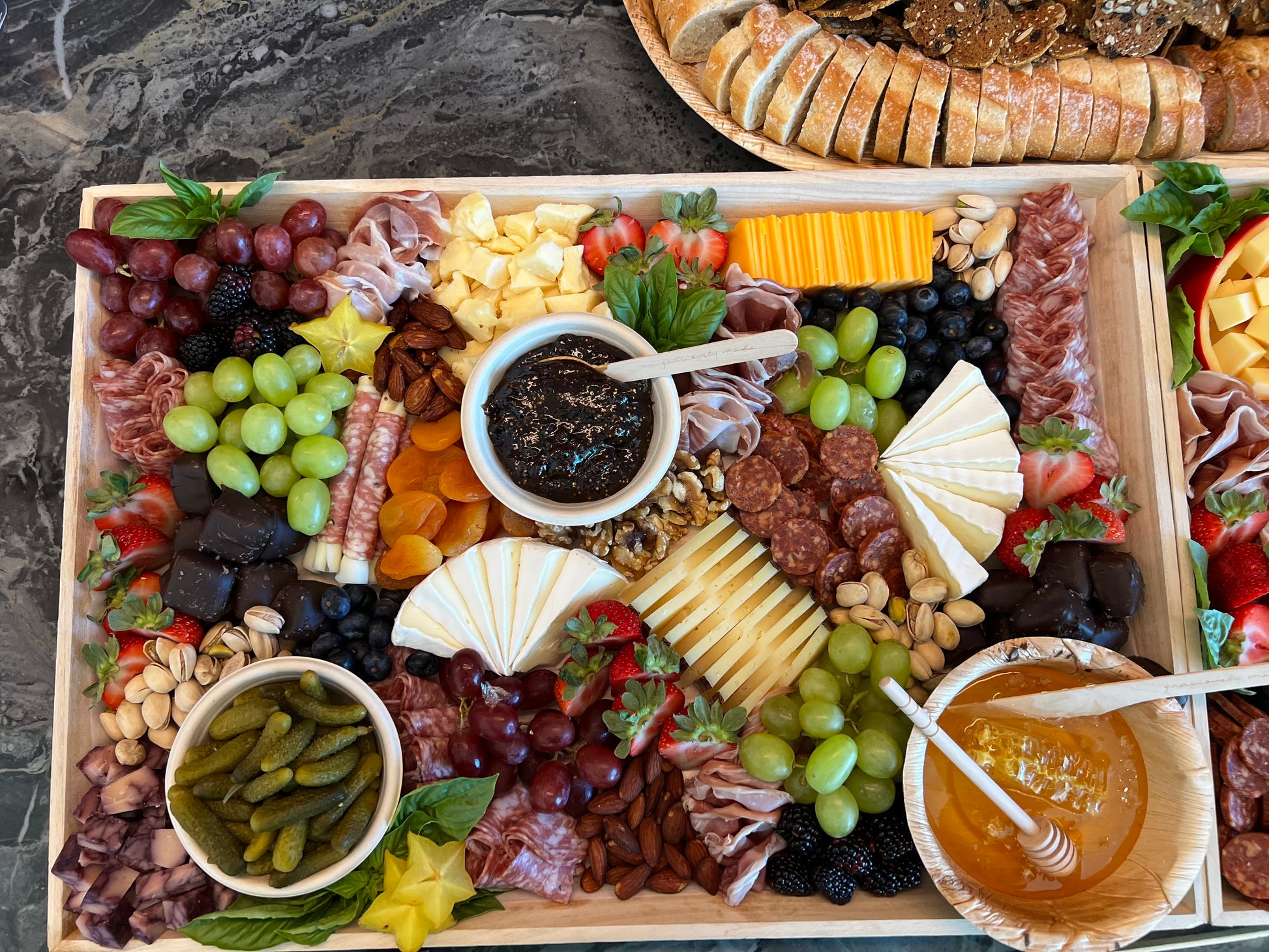 Similar to a graze, I'll reach out to discuss any personalized touches you desire. Additionally, each board includes a carb tray featuring assorted crackers and bread. Last photo shows two boards pushed together. Each travel board serves up to 20.