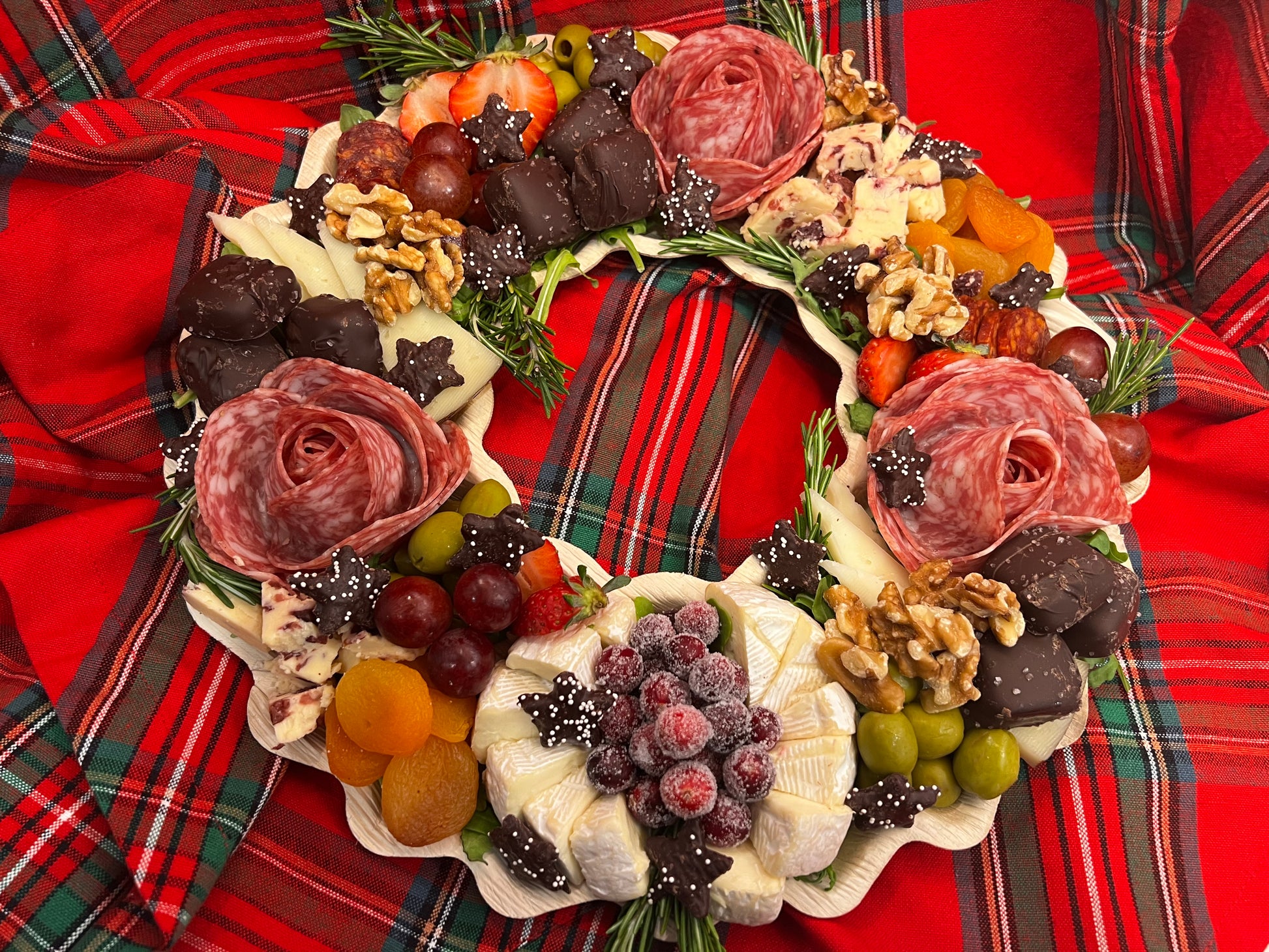 Arrangement includes a variety of meats, cheeses, fresh and dried fruit, nuts, and other accompaniments. The board's contents are subject to change depending on availability and season, and can serve 6-8 people as an appetizer.