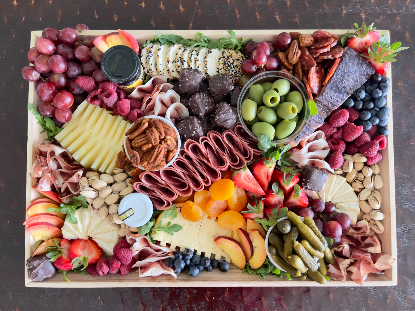 The XLarge rectangle (19"x14") wood board includes a variety of four meats, five cheeses, fresh and dried fruit, nuts, honey, jam, and other accompaniments. The board's contents are subject to change depending on availability and season, and can serve up to 15 people.